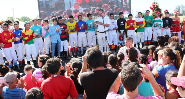 UTTA aprovechó la cercanía del Día Nacional del Jockey, que se celebró el 15 de diciembre, para homenajear a estas figuras claves de la actividad hípica. Pablo Falero fue el emblema en los festejos por el reconocimiento a los jockeys; compartiendo el escenario con sus colegas del Hipódromo de las Flores, a quienes entregó obsequios junto al Secretario General Carlos Felice. Se proyectaron también dos videos generados especialmente como homenaje a su trayectoria, reconocida principalmente desde el afecto del público, que no paró de saludarlo, abrazarlo y sacarse tantas fotos como los niños con Papá Noel. En esta oportunidad también fue reconocido el jockey Claudio Olivarez, ganador de la estadística Santa Fe 2014.