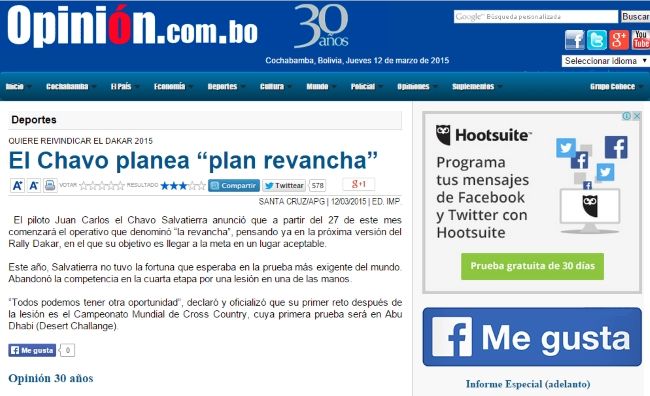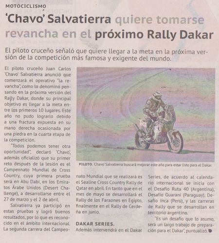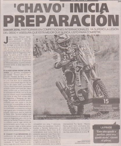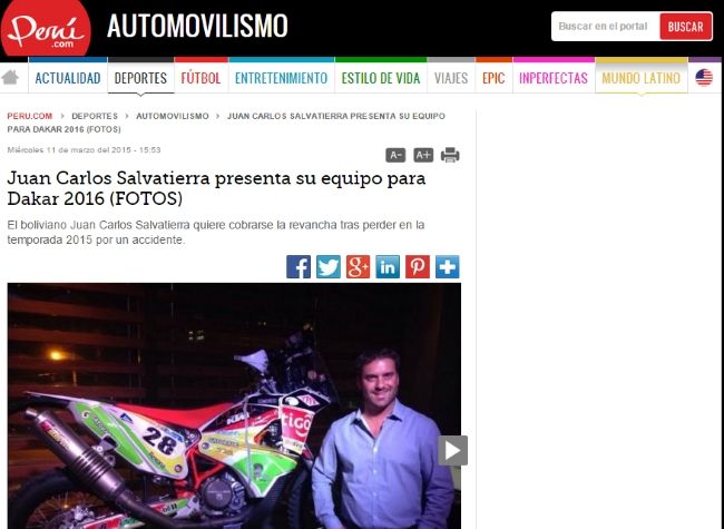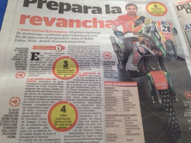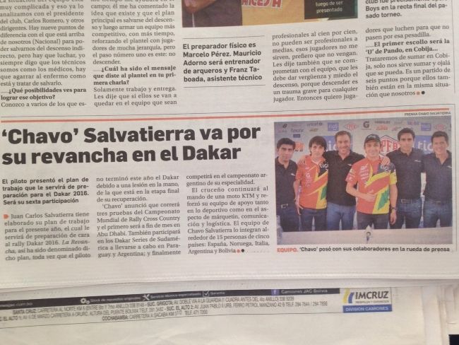 El piloto cruceño Juan Carlos Salvatierra presentó a su equipo de cara al Rally Dakar 2016 donde buscará #LaRevancha, tras la fatídica piedra que lo sacó del camino en la edición 2015.