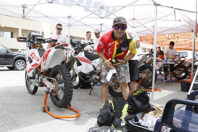 La moto está lista y el piloto también. Sólo falta dar el primer acelerón. Juan Carlos Salvatierra pasó hoy la revisión técnica y administrativa del Rally de Abu Dhabi y sólo espera la cuenta regresiva para subirse a la KTM y acelerar a fondo.