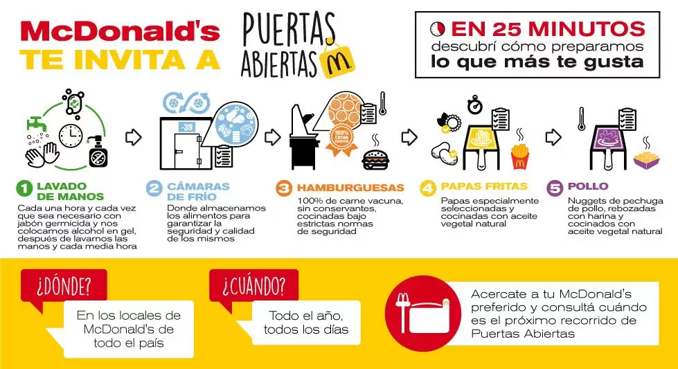 A través del programa Puertas Abiertas McDonald's propone a los clientes hacer un recorrido por sus cocinas. En cualquier momento y en cualquier local pueden conocer los procedimientos en cada etapa de elaboración de su comida y la calidad de todos sus ingredientes. En lo que va del año, más de 340 mil personas ya participaron del programa realizando visitas en donde pudieron ver el detrás de escena de las hamburguesas más famosas.