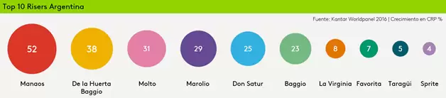 Un caso de éxito este año es la marca nacional de gaseosas Manaos, que logró sumar cinco puntos de penetración, equivalente a 650 mil hogares, escalando 24 posiciones en el ranking y ubicándose dentro del top 25 de Argentina.