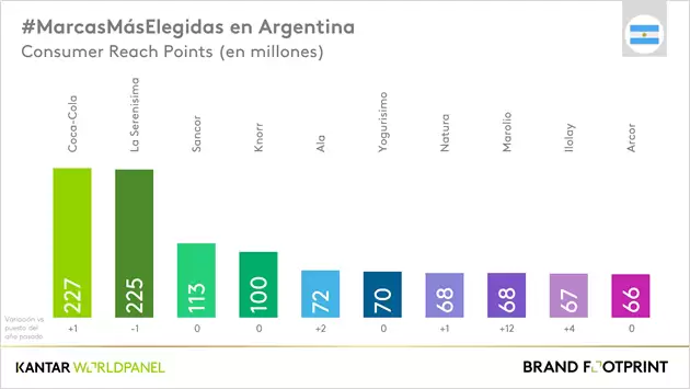El ranking de marcas más elegidas por los argentinos lo lideran Coca-Cola y La Serenísima, seguidas por Sancor, Knorr y Ala de acuerdo al estudio Brand Footprint que realizó por quinto año consecutivo Kantar Worldpanel, basado en la métrica Consumer Reach Points (CRP) que mide cuántos hogares compran una marca -penetración- y qué tan seguido lo hacen -frecuencia-, proporcionando una representación real de la elección del comprador.