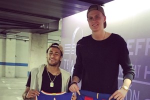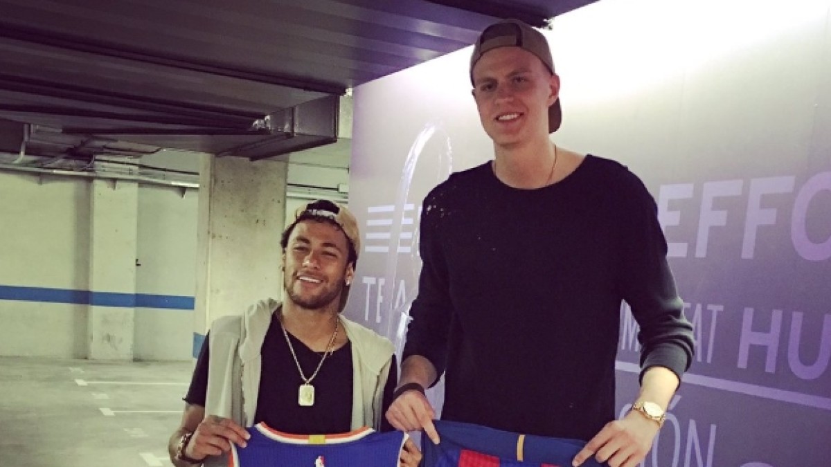 En esta ocasión Neymar se juntó con Kristaps Porzingis jugador de los New York Knicks, quien homenajeó al brasileño con su camiseta autografiada que curiosamente triplica el talle del futbolista.