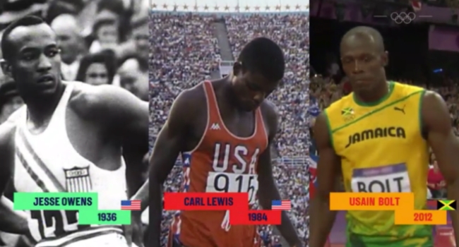 Mediante un gran trabajo de edición, la agencia Eurosport realizó un emotivo video en el cual compara tres de los más grandes hitos de la historia del atletismo olímpico, situando en una virtual misma carrera a Jesse Owens, Carl Lewis y Usain Bolt, con las respectivas carreras que rompieron récords mundiales.