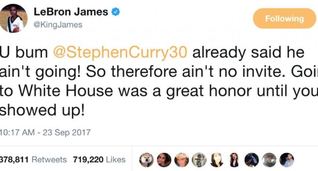 Y es que, tras responder una de las acciones más criticadas del presidente Donald Trump y su “des invitación” a su colega y amigo Stephen Curry para la Casa Blanca decantó en la originalidad y sarcasmo de LeBron a través de su cuenta personal de Twitter.