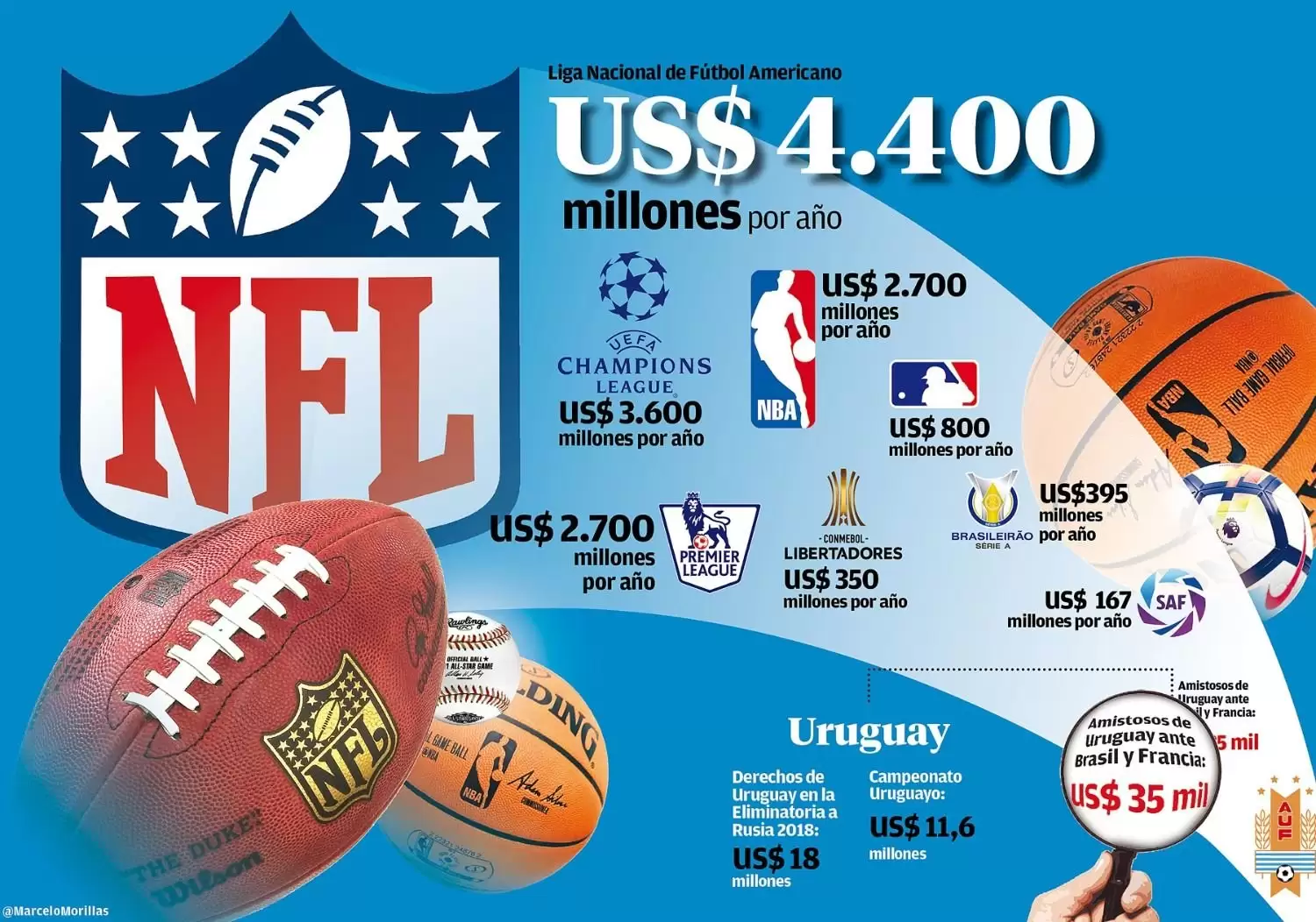Más atrás aparece la MLB, otro de los deportes que más dinero genera en Estados Unidos con un valor de 800 millones, la CONMEBOL Libertadores (350 millones) y sorpresivamente el Brasileirao por encima del torneo continental con 395 millones de por medio.