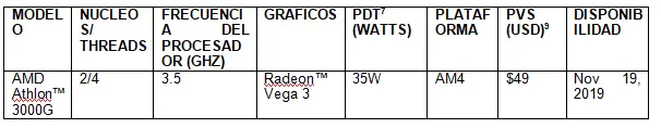 D Athlon 3000G: Un procesador versátil para el día a día, desbloqueadoAMD también anunció una actualización significativa para los usuarios de escritorio en general con el nuevo procesador AMD Athlon 3000G, que llegará el 19 de noviembre. El nuevo AMD Athlon 3000G con gráficos Radeon™ trae experiencias de cómputo confiable al alcance de un amplio rango de usuarios, desde los requerimientos diarios de alta definición en PC gaming, ofreciendo transiciones más fluidas en cada partida y un rendimiento para productividad mejorado sobre la competencia4 a un precio increíble. El procesador Athlon 3000G es el primer Athlon basado en “Zen” que está desbloqueado para desatar su potencial para overclocking, convirtiéndose en el único procesador desbloqueado de su categoría10.