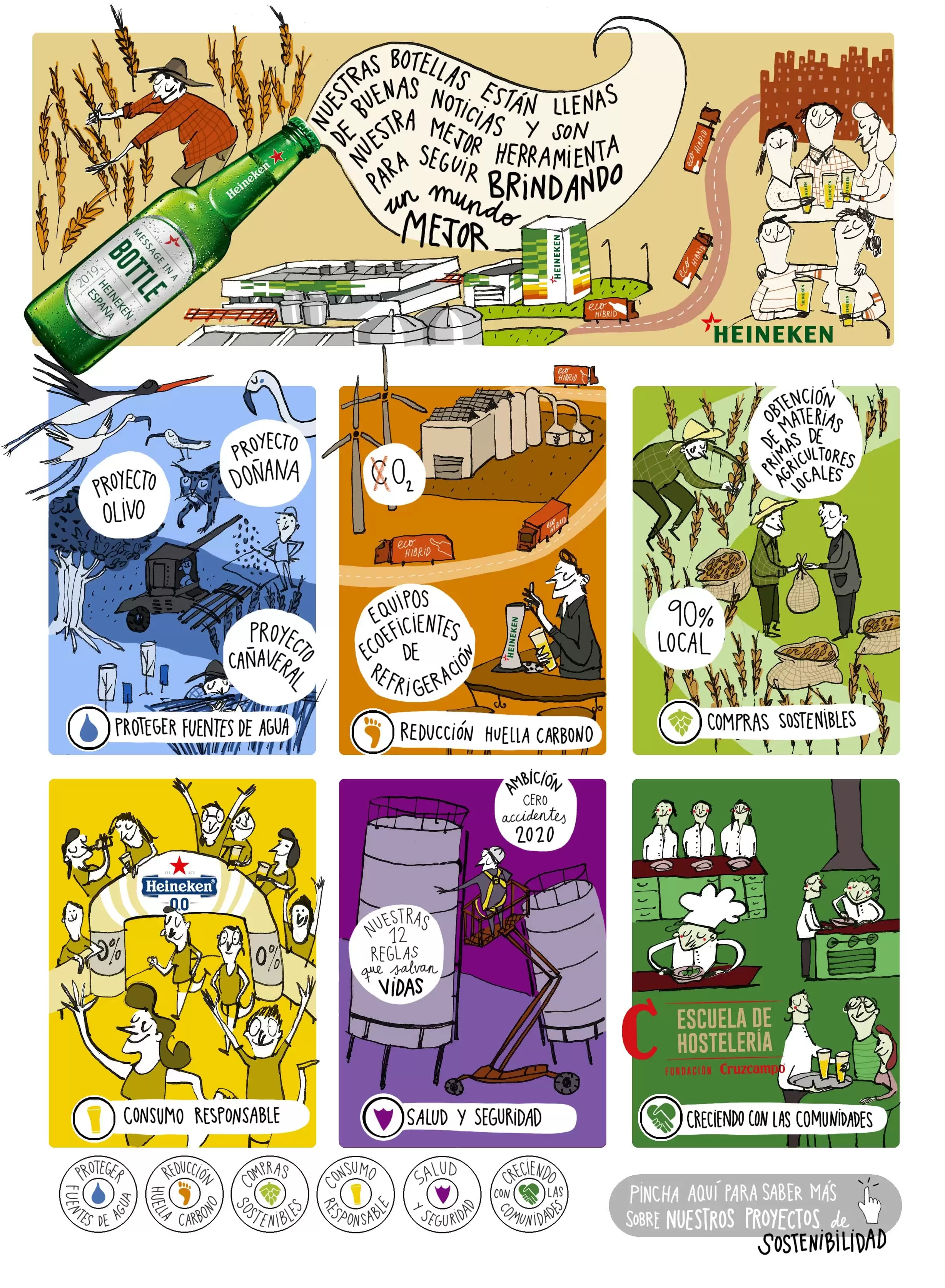 Tras el éxito de la campaña “Message in a bottle”, Heineken sorprendió a propios y extraños esta semana al presentar sus seis pilares de Responsabilidad Social Empresarial (RSE), directamente vinculados con la sustentabilidad por medio de una ilustración interactiva.