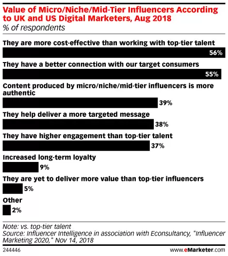 A la hora de afrontar todos estos costos, las marcas han comenzado a apostar cada vez más por cuentas que tienen menor cantidad de seguidores, pero a la vez, que sean perfiles que tengan como objetivo convertirse en Influencers. Según una encuesta realizada por Ecosultancy, el 56% de los especialistas en marketing de Estados Unidos y Reino Unido han comenzado a elegir trabajar con microinfluencers por su menor coste.