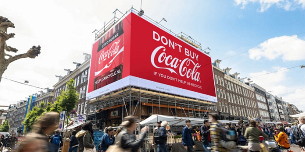 En esta ocurrente campaña, la marca dice en letras grandes: "No compres Coca-Cola", para después rematar el mensaje en letras chicas con un: "Si no nos ayudas a reciclar".