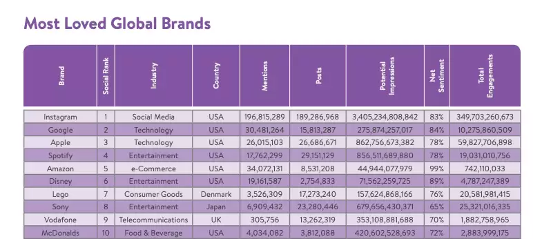 Con Instagram, Google y Apple en la cima de la lista, las firmas con mejor retorno desde las redes sociales, forman parte, en su gran mayoría, de la industria del Entretenimiento, en donde: Spotify (4), Disney (6) y Sony (8) y Vodafone (9) componen el Top 10 del ranking, demostrando hacia donde miran los consumidores hoy y a qué se dedican.
