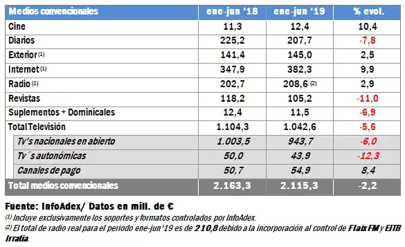 Lo sigue la Internet con un crecimiento del 9,9%, que se traduce en una inversión, en el periodo enero-junio de 2019, de 382,3 millones de euros. La radio completa el Top 3 con una inversión de 208,6 millones de euros y un decrecimiento considerable desde hace algunos años.