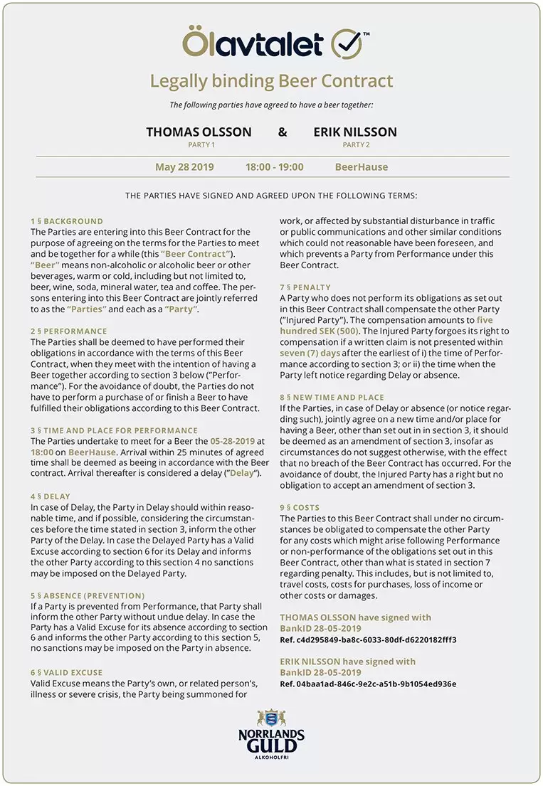 A través de una ingeniosa campaña que ya circula por todos los medios posibles de comunicación, la marca sueca de cerveza Norrlands Guld, propuso un contrato en el donde se estipula una multa a los “amigos” que cancelan a último minuto como parte de su nueva campaña denominada: “Beer Contract”.