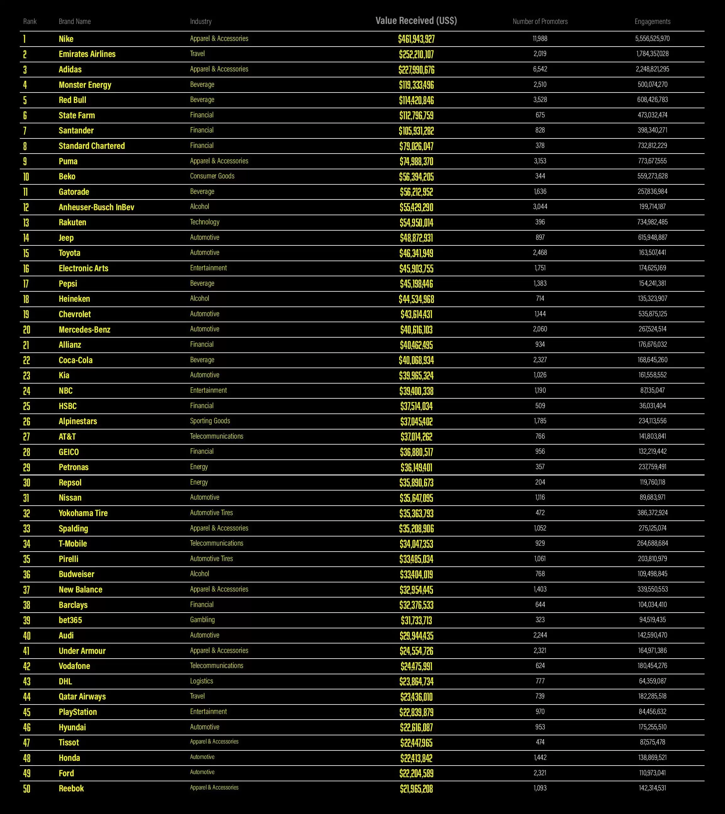 Según Hookit, Nike encabeza el ranking con una valoración en “redes sociales” de sus acciones de patrocinio de $ 462 millones de dólares entre agosto de 2019 y agosto de 2020. En segundo puesto se encuentra Emirates ($252 millones) y en tercer lugar, adidas ($228 millones).