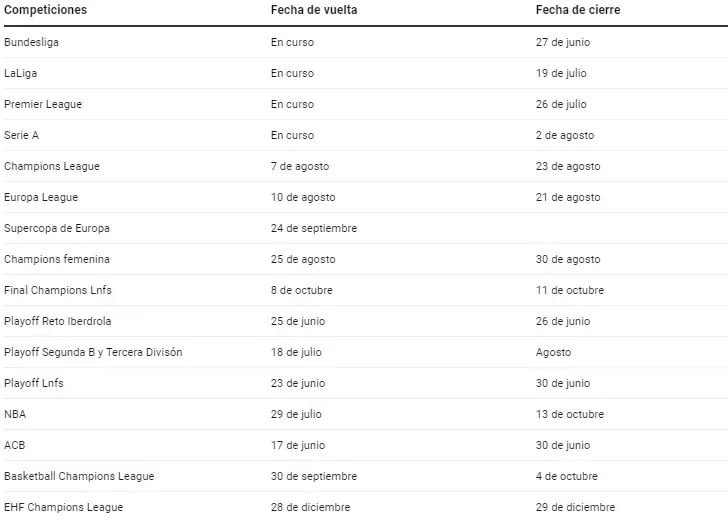 Yendo disciplina por disciplina, comenzamos por el fútbol. De las 5 grandes ligas de Europa, salvo por la de Francia, todas ya regresaron y reacomodaron sus fechas para que sus torneos terminen antes de que se reanuden las competencias internacionales de la UEFA. La Champions League irá del 7 al 23 de agosto y la Europa League del 10 al 21 de agosto.