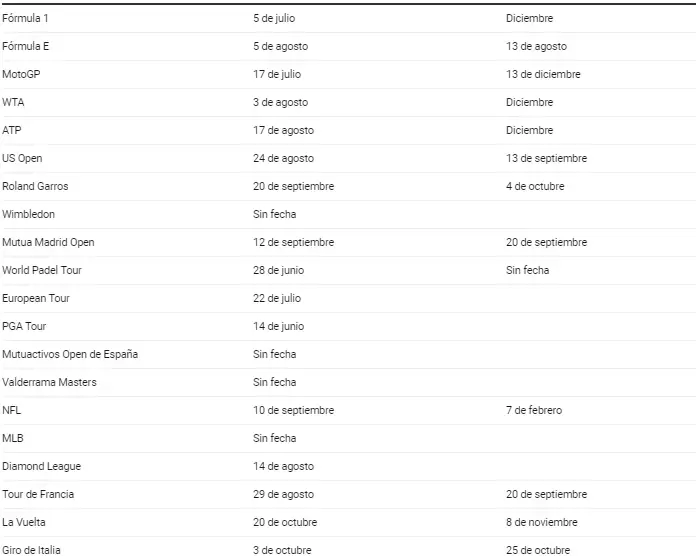 El atletismo tendrá su esperado regreso con el Diamond League el 14 de agosto y el ciclismo con el Tour de Francia, el Giro de Italia y La Vuelta el 29 de agosto, 3 de octubre y 20 de octubre, respectivamente.