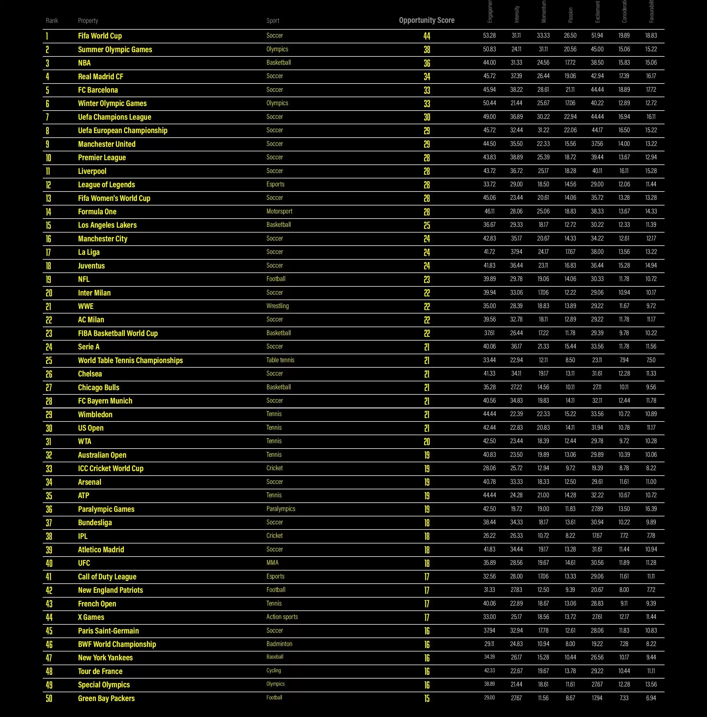 La pasión que genera y mueve el fútbol se ve reflejado en que de los 10 primeros lugares del ranking, 7 están ocupados por clubes, asociaciones o torneos relacionados al fútbol. Además, de los 50, 20 son de fútbol. Los 3 puestos restantes del top 10 los completan los Juegos Olímpicos (verano e invierno) y la NBA.