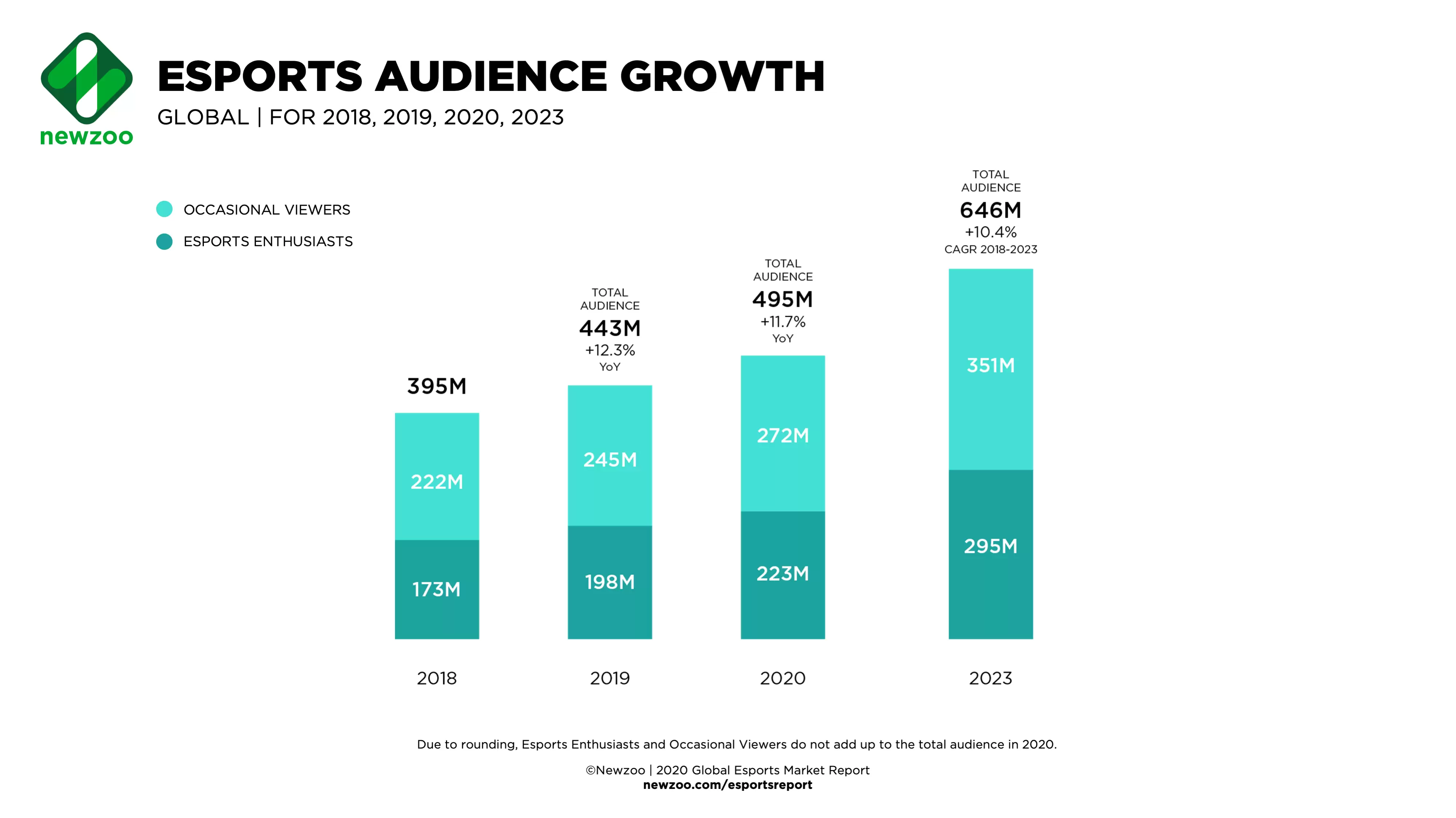 Los especialistas auguran que la audiencia de los deportes electrónicos debería llegar a 495 millones de personas en 2020. Para 2023, se espera que esta llegue a 646 millones.