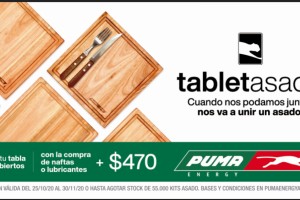 Por ello, con cada carga de naftas o compra de lubricantes en las Estaciones de Servicio Puma Energy más 470 pesos, cada cliente se podrá llevar una tabla individual de madera de eucalipto y un par de cubiertos parrilleros marca Tramontina.