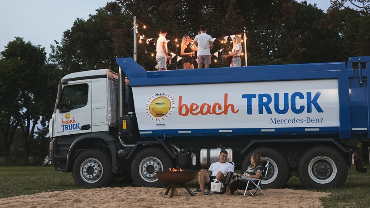 En la actual temporada estival, Mercedes-Benz Camiones volvió a atraer la atención con una nueva acción de verano. Se llenó de arena la caja volcadora de uno de sus camiones todo terreno más robustos, un Arocs 4845, convirtiéndose en un “Beach Truck”, donde se mostraron encuentros de amigos, juegos y momentos de relax.