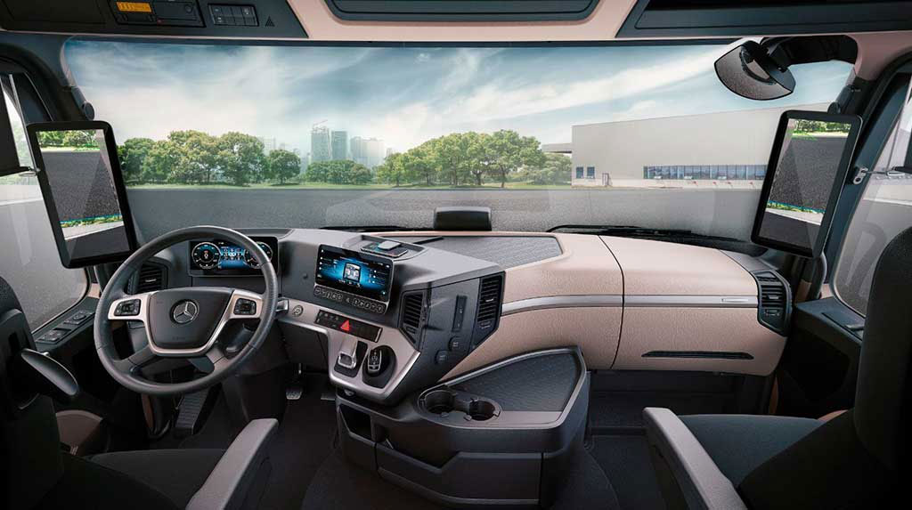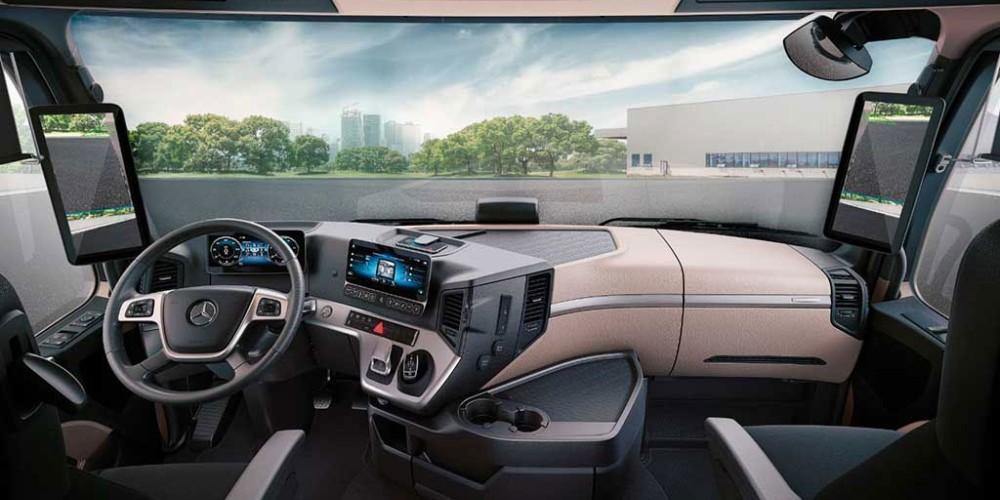 Dentro de la cabina, todos los elementos están ubicados de forma armónica y simple, centrados en el conductor. En el centro del tablero se encuentra el Multimedia Cockpit, compuesto por una pantalla principal de 10” en la posición del conductor y otra generosa pantalla secundaria, también de 10”, en el centro del vehículo. Ambas se comandan desde el volante multifunción; pero la pantalla secundaria, que conecta inteligentemente al conductor con el camión, también es táctil, muy ágil e intuitiva. Desde allí se puede comandar desde el nivel de la suspensión neumática trasera hasta los controles de la radio, pasando por el control de luces de interior y exterior, sistema de climatización, conexión Bluetooth de hasta dos dispositivos de forma simultánea y conexión con el Smart Phone a través de Apple Car Play o Android Auto, entre otras. Esta pantalla cuenta además con botones por debajo de la misma que funcionan como atajos para comandar directamente algunas funciones principales, como el aire acondicionado o volumen de la radio.