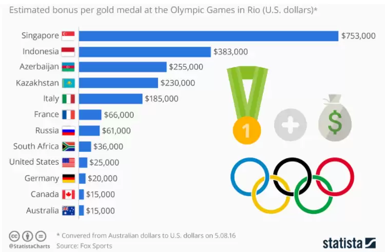 Los 3 países que más dinero reparten por una medalla de oro son Singapur, Indonesia y Azerbaiyán con unos 753.000, 383.000 y 255.000 dólares, respectivamente. Del otro lado de la moneda están Reino Unido, Suecia, Croacia y Noruega que no pagan a sus ganadores.