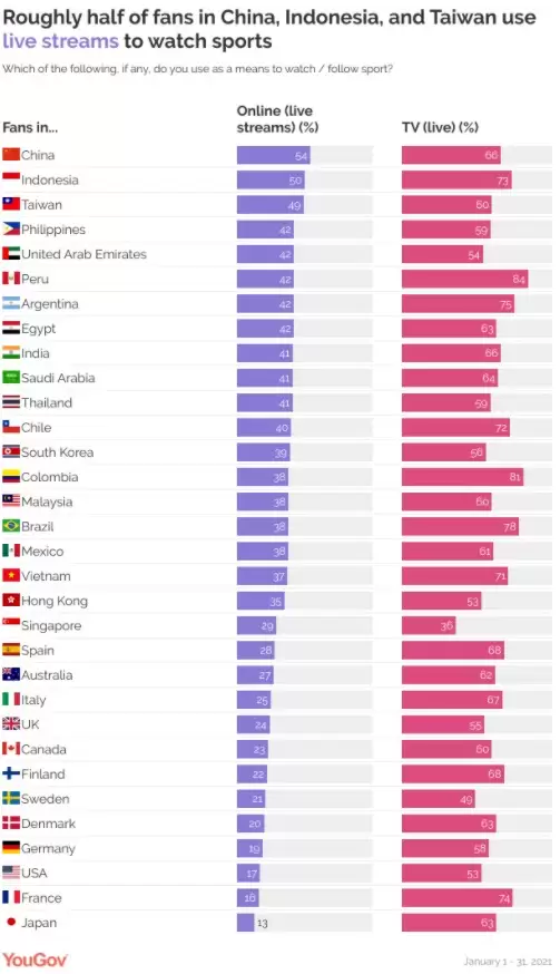 La empresa YouGov, líder en investigación de mercado internacional basada en Internet, llevó adelante un estudio sobre el consumo del deporte en los distintos países del mundo. A través de una encuesta, sacaron varias conclusiones sobre cómo la sociedad consume los deportes hoy en día.