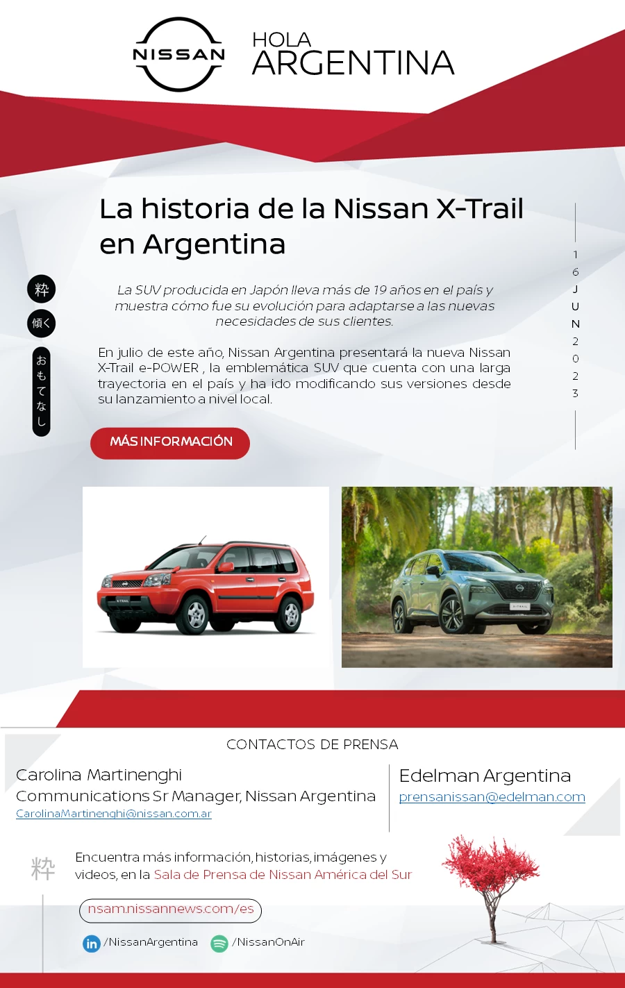 En julio de este año, Nissan Argentina presentará la nueva Nissan X-Trail e-POWER , la emblemática SUV que cuenta con una larga trayectoria en el país y ha ido modificando sus versiones desde su lanzamiento a nivel local.