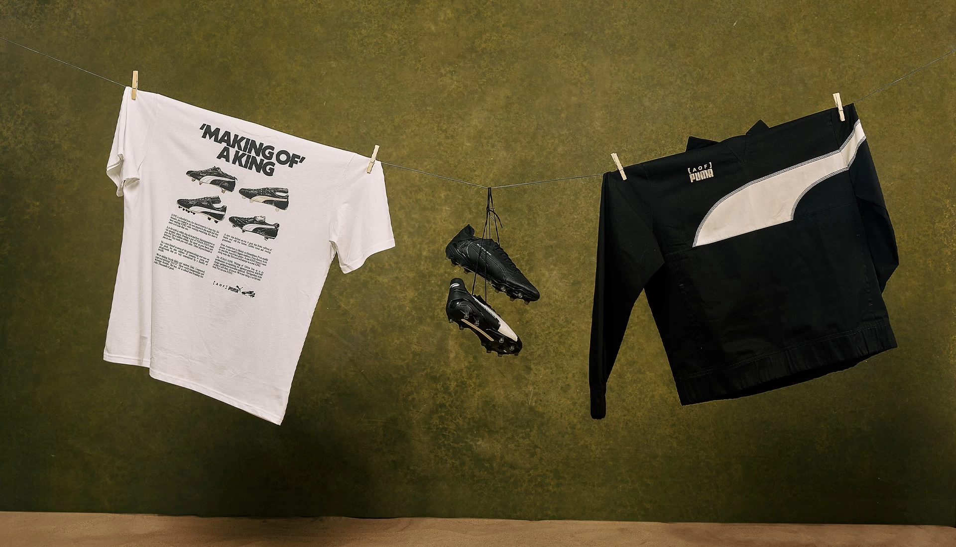 La Puma King Ultimate ART OF FOOTBALL busca ser fiel al estilo que ha caracterizado a la bota a lo largo de los años y utiliza la clásica base negra con una combinación de colores blanco y dorado. Además, presenta costuras cosidas a mano en la parte superior y el logo de AOF KING.