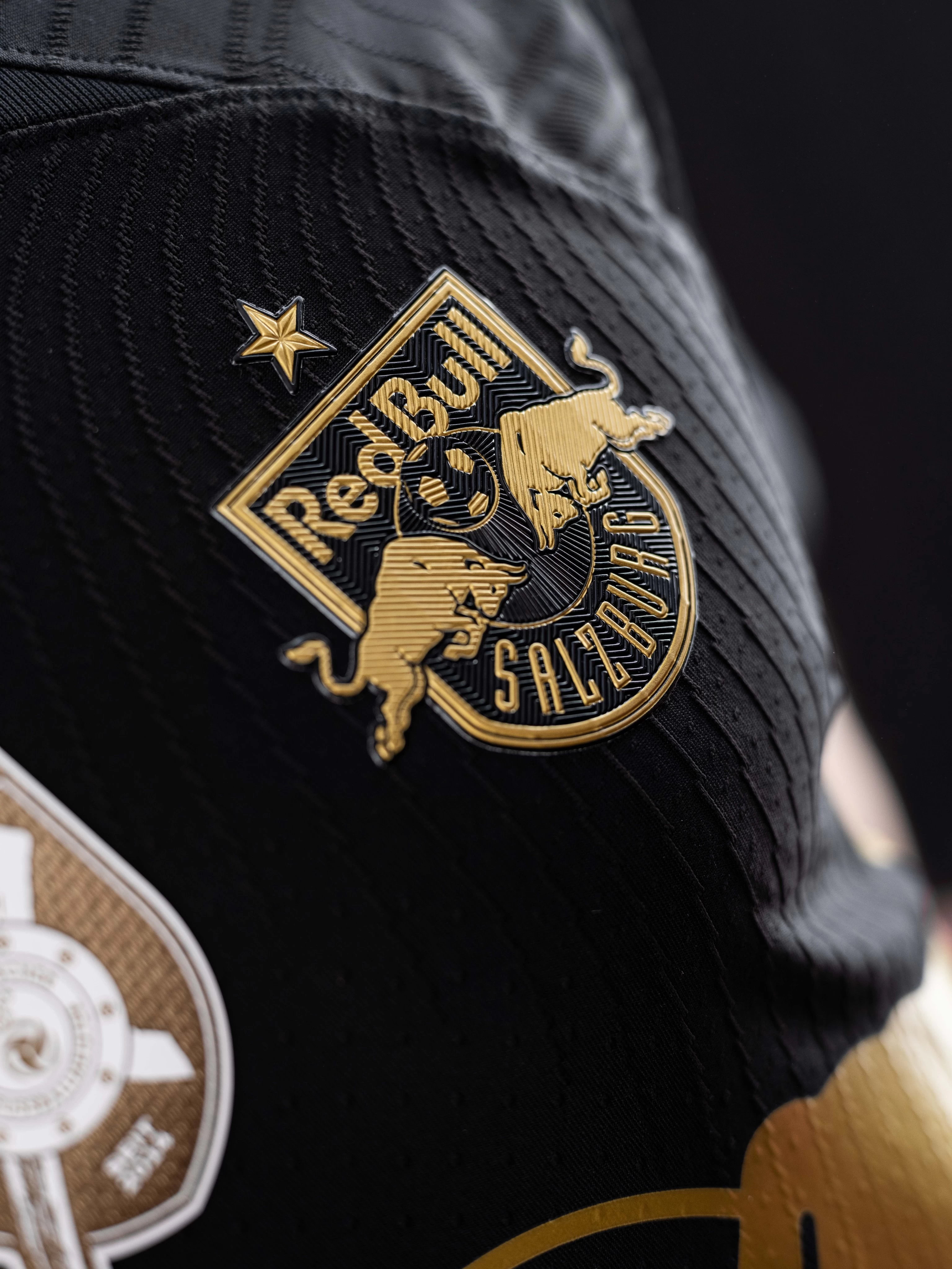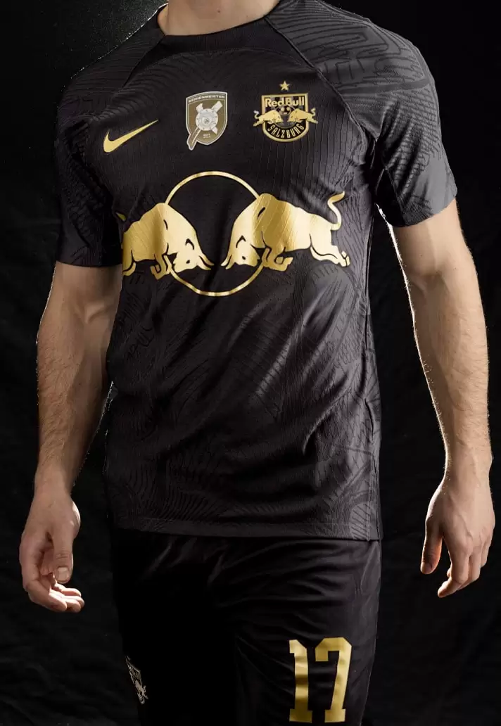 En el duelo contra Austria Klagenfurt, Salzburgo lucirá un uniforme negro y dorado de edición limitada especialmente creado por su sponsor técnico. La nueva camiseta presenta una base negra, lo que garantiza que toda la atención se centre en los detalles dorados del escudo del club, Nike Swoosh, el logotipo del patrocinador de Red Bull y, lo que es más importante, el emblema de los campeones, todos inspirados en la placa ganadora del título.