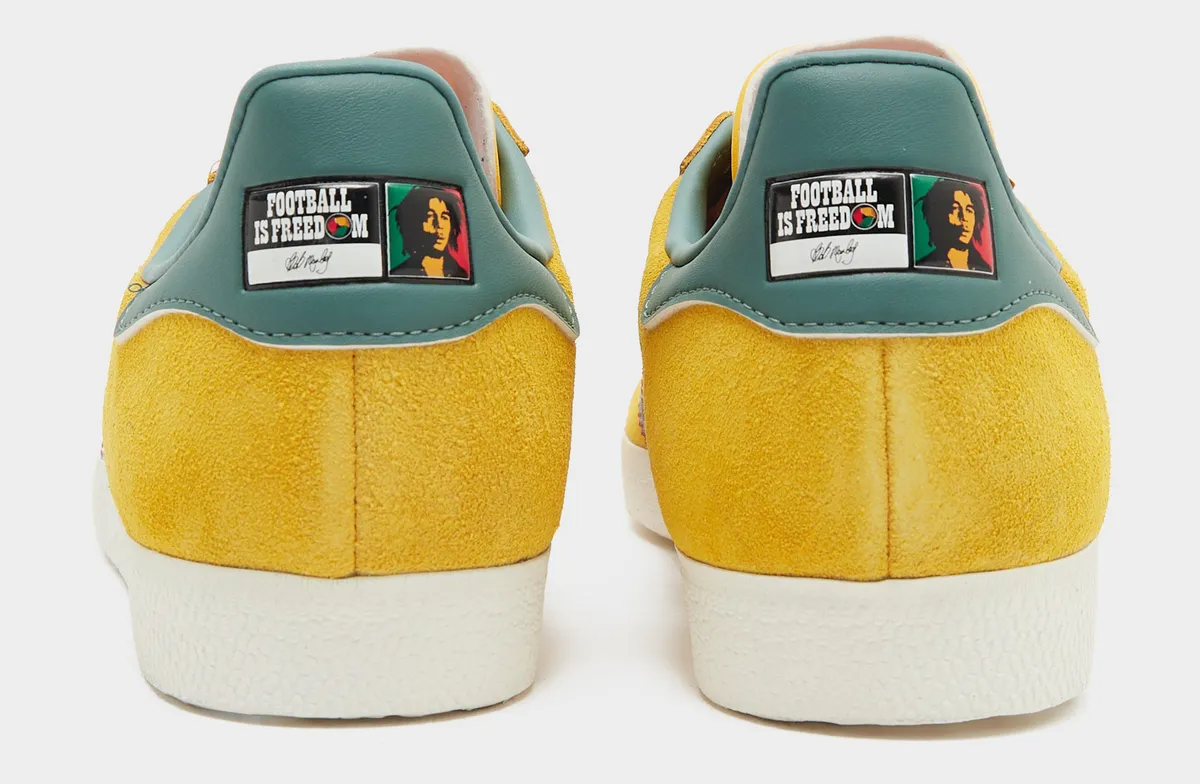 El diseño profundiza su narrativa a través de detalles gráficos. En la lengüeta se destaca una ilustración del rostro del músico junto a su firma manuscrita y la frase “Football Is Freedom”, una cita que refuerza el vínculo entre el deporte, la libertad y la cultura popular, ejes históricos tanto para adidas como para el artista jamaiquino.