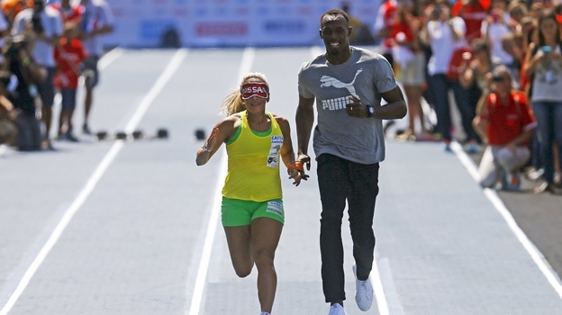 Bolt corrió junto a Tereza Guilhermina, la velocista ciega más rápida del mundo. Guilhermina ganó los 100, 200 y 400 metros en Londres 2012 y los 200 metros en Pekín 2008.