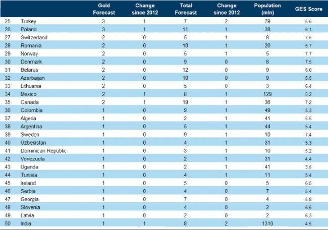 Los economistas de Goldman Sachs publicaron una nueva edición de su informe olímpica “The Olympics a Economics”, donde dan cuenta de la cantidad de medallas que podría ganar cada país en los Juegos Olímpicos de Río, basándose en aspectos económicos de las delegaciones, sus rendimientos anteriores, y el Growth Environment Score (GES) que analiza el contexto de preparación.