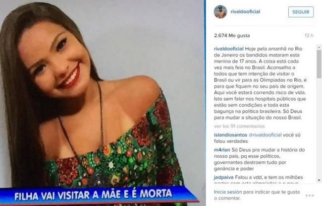 “Esta mañana, en Río de Janeiro, unos delincuentes han matado a esta chica de 17 años. La cosa está cada vez más fea en Brasil. Aconsejo a todos los que tengan la intención de visitar Brasil o venir para los Juegos Olímpicos de Río que se queden en su país de origen. Aquí usted estará poniendo en riesgo su vida", publicó Rivaldo, el histórico futbolista brasilero que brillara con la camiseta del Barcelona.