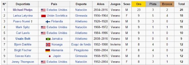 Con Michael Phelps a la cabeza, y muy lejos, con sus 23 oros, 3 platas y 2 bronces, Río 2016 dejó algunos cambios en el ranking de deportistas más premiados en la historia de los Juegos Olímpicos.