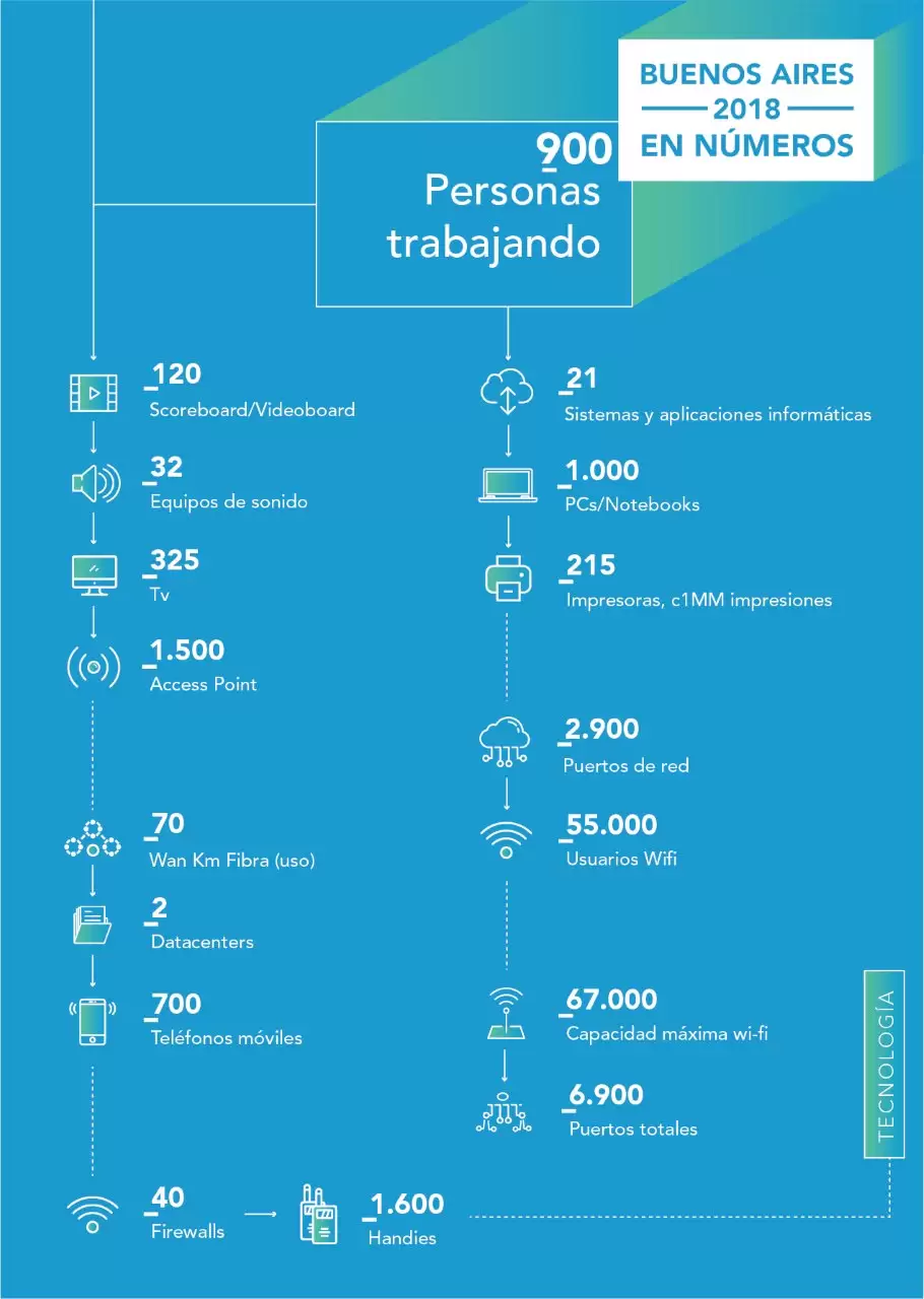Las tareas de tecnología van a demandar el trabajo de 900 personas, cantidad que por ejemplo supera ampliamente la de atletas argentinos presentes entre las dos primeras ediciones de los Juegos Olímpicos de la Juventud, porque 59 participaron en Singapur 2010 y otros 62 estuvieron en Nanjing 2014. Ni siquiera se llega a 900 si sumamos los 213 deportistas de nuestro país que viajaron a Rio 2016.