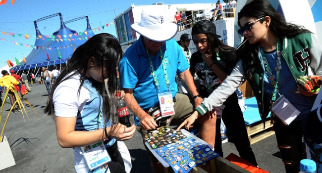 El hombre de 71 años de edad, nacido en Atlanta, Estados Unidos se encuentra hoy mostrando su colección de pines entre los jóvenes allí presentes “Acá traje algunos, pero en mi casa tengo 30.000”, confiesa.
