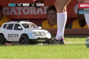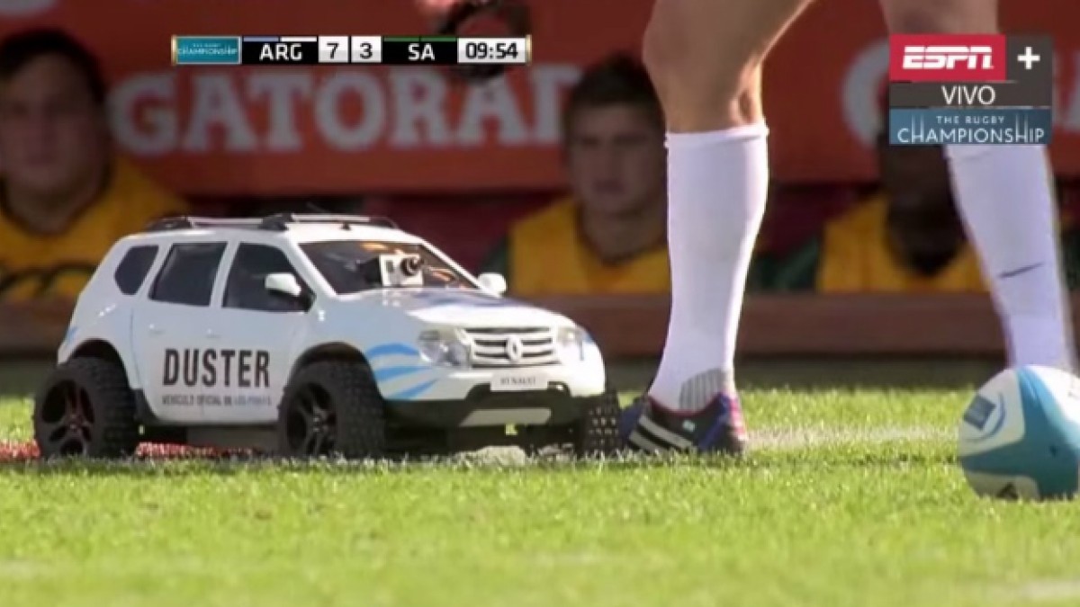 ¿De qué se trataba la acción? Renault se planteó la posibilidad de poner un zocalo durante las trasmisiones de los paridos de Los Pumas durante el Rugby Championship, algo clásico pero que se utiliza mucho. Luego de observar varias opciones decidieron ir un poco más allá, salirse de lo común y jugar más con la realidad. Por eso, crearon el Renault Duster Tee Carrier, una réplica exacta de la SUV de Renault, la Duster 4x4, que durante los partidos del Rugby Championship ingresaba a la cancha y le llevaba el tee al pateador del equipo argentino cada vez que había un penal o una conversión.