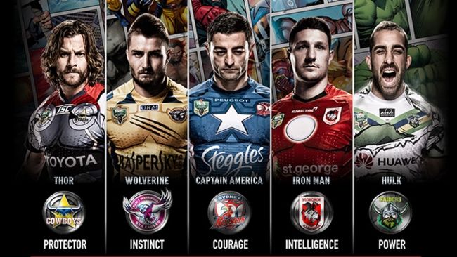 Así, los Manly Warringah Sea Eagles homenajearon a Wolverine, los Sydney Roosters al Capitán America, los St. George Illawarra Dragons a Iron Man, North Queensland Cowboys a Thor y los Canberra Raiders al Increíble Hulk.