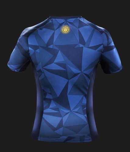 El escudo de la UAR, de gran terminación, está aplicado con calor lo que sustituye las costuras, evitando el roce con la piel en la parte interna. En el dorso, como siempre está presente el icónico sol de la bandera Argentina que destaca el sentir nacionalista de Los Pumas.