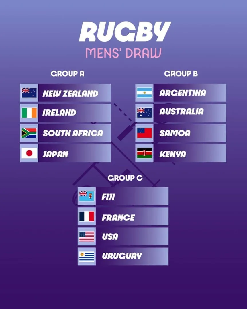 Argentina enfrentará a Australia, que quedó cuarto en el Circuito Mundial de Rugby Seven (Los Pumas lo derrotaron en dos finales a lo largo del mismo), a Samoa y a Kenia, descendido y ascendido al SVNS respectivamente. Por otra parte, el Grupo A está compuesto por Nueva Zelanda, Irlanda, la reciente clasificada Sudáfrica y Japón, mientras que Fiji, la local Francia, Estados Unidos y Uruguay estarán en el C, completando los participantes en París 2024.