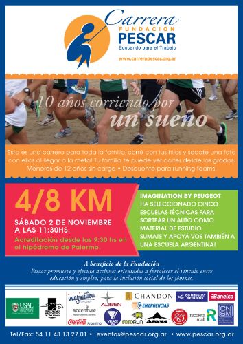 Peugeot Argentina desde su programa de responsabilidad social empresaria invita a participar de la Carrera Fundación Pescar el día 2 de noviembre desde las 9.30 horas, en el Hipódromo Argentino de Palermo, con carreras de 4 K y 8 K.; un evento para que los corredores compartan el día en familia y puedan correr con sus hijos así como para aquellos que no corran que podrán disfrutar del evento desde las gradas y a través de las actividades y juegos para los más chicos.