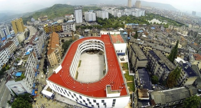 En Tiantai, China, se construyó una novedosa pista de atletismo. A pesar de estar situada en uno de los países más avanzados tecnológicamente, no es innovadora por este aspecto. Por lo contrario, se destaca al estar construido en la terraza de una escuela.