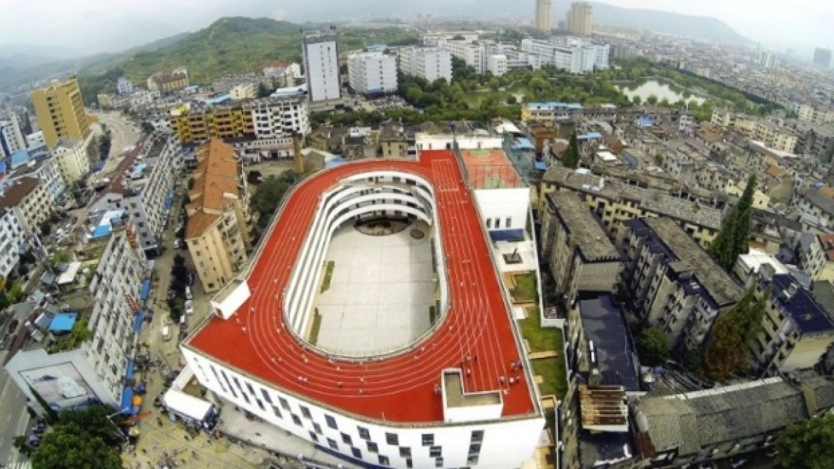 En Tiantai, China, se construyó una novedosa pista de atletismo. A pesar de estar situada en uno de los países más avanzados tecnológicamente, no es innovadora por este aspecto. Por lo contrario, se destaca al estar construido en la terraza de una escuela.