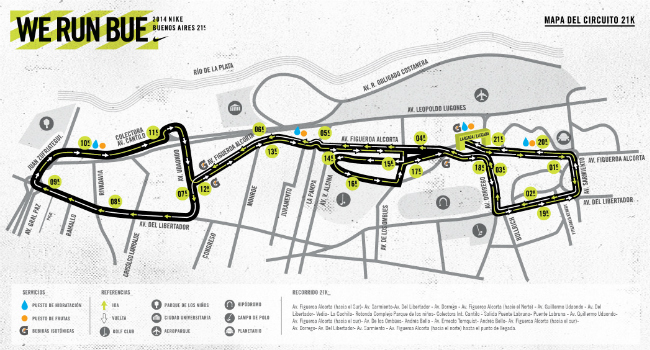 El recorrido diseñado por el Club de Corredores, es: Av. Figueroa Alcorta (hacia el Sur)- Av. Sarmiento-Av. Del Libertador - Av. Dorrego - Av. Figueroa Alcorta (hacia el Norte)- Av. Guillermo Udaondo- Av. Del Libertador- Vedia- La Cachila- Rotonda Complejo Parque de los niños- Colectora Int. Cantilo- Salida Puente Labruna- Puente Labruna- Av. Guillermo Udaondo- Av. Figueroa Alcorta (hacia el sur)- Av. De los Ombúes- Andrés Bello- Av. Ernesto Tornquist- Andrés Bello- Av. Figueroa Alcorta (hacia el sur)- Av. Dorrego- Av. Del Libertador- Av. Sarmiento- Av. Figueroa Alcorta (hacia el norte) hasta el punto de llegada.