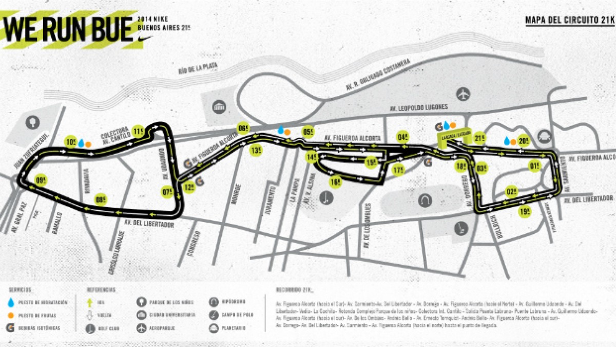El recorrido diseñado por el Club de Corredores, es: Av. Figueroa Alcorta (hacia el Sur)- Av. Sarmiento-Av. Del Libertador - Av. Dorrego - Av. Figueroa Alcorta (hacia el Norte)- Av. Guillermo Udaondo- Av. Del Libertador- Vedia- La Cachila- Rotonda Complejo Parque de los niños- Colectora Int. Cantilo- Salida Puente Labruna- Puente Labruna- Av. Guillermo Udaondo- Av. Figueroa Alcorta (hacia el sur)- Av. De los Ombúes- Andrés Bello- Av. Ernesto Tornquist- Andrés Bello- Av. Figueroa Alcorta (hacia el sur)- Av. Dorrego- Av. Del Libertador- Av. Sarmiento- Av. Figueroa Alcorta (hacia el norte) hasta el punto de llegada.