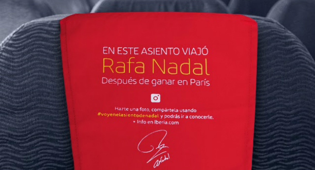 Iberia puso en marcha un acción llevada adelante por OgivlyOne que tiene como principal protagonista a Rafa Nadal, y en la cual los usuarios de la línea área podrán viajar en el mismo asiento que viajó el tenista luego de haber ganado alguno de sus tantos títulos.
