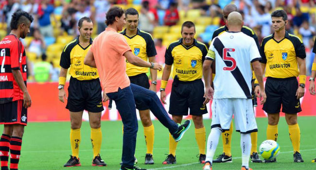 Por eso, en su visita a Brasil, Rafael Nadal continuó sus visitas a lugares emblemáticos de Rio de Janeiro al dar el puntapié inicial este domingo en el estadio Maracaná, sede de la final de la Copa del Mundo, para el partido entre Vasco da Gama y Flamengo.