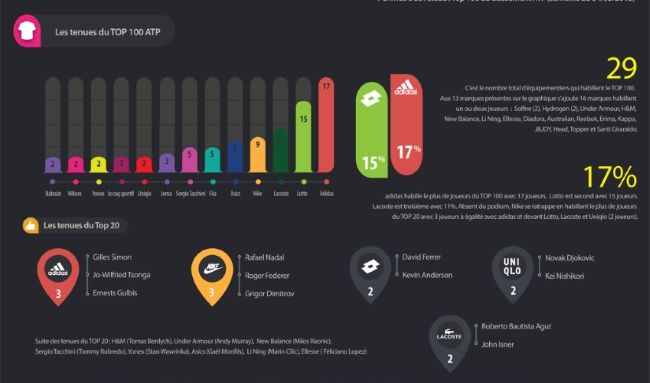 De esta manera, se supo que en términos de vestimenta adidas aparece en lo más alto, con 17 sobre 100 jugadores, en más de trece marcas relevadas. Además, si el ranking se ajusta al top 20, adidas también llega al primer lugar con tres representados: Gilles Simon, Jo-Wilfried Tsonga y Ernest Gulbis.