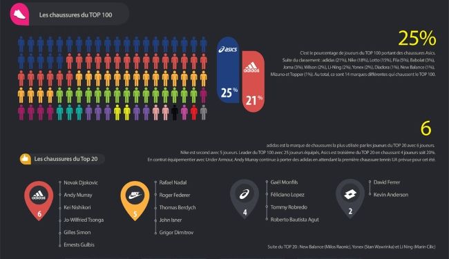 En lo que refiere al calzado, Asics aventaja a adidas por 25% a 21% en el centenar de jugadores mejor rankeado del circuito. Sin embargo, adidas es amplio ganador en el top 20, con seis jugadores entre los que aparecen Djokovic, Murray, Nishikori, Tsonga, Simon y Gulbis.